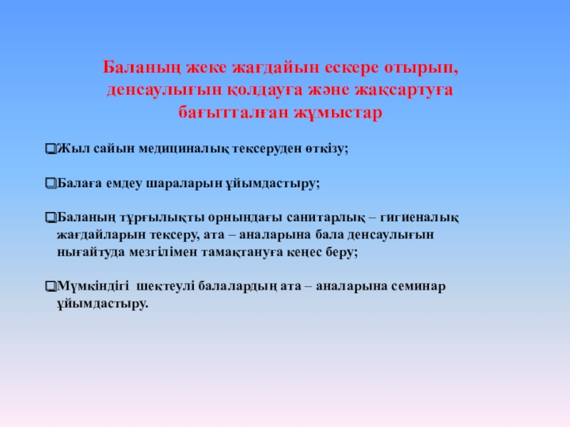 Слайд 13Баланың жеке жағдайын ескере отырып, денсаулығын қолдауға және жақсартуға бағытталған жұмыстар