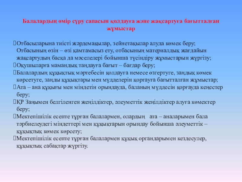 Балалардың өмір сүру сапасын қолдауға және жақсартуға бағытталған жұмыстар