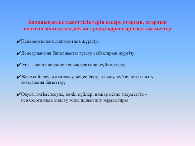 Слайд 14Баланың жеке қажеттіліктерін ескере отырып, олардың психологиялық жағдайын түзеуді қарастыратын қызметтер