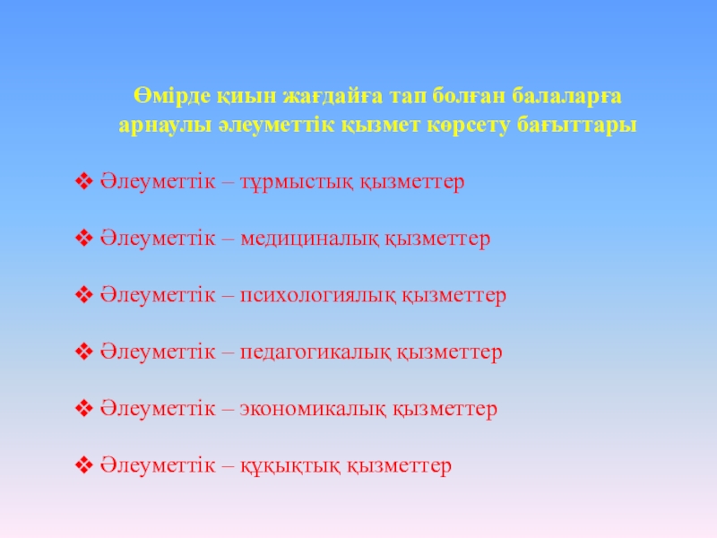 Слайд 11Өмірде қиын жағдайға тап болған балаларға арнаулы әлеуметтік қызмет көрсету бағыттары