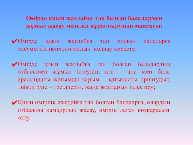 Слайд 4Өмірде қиын жағдайға тап болған балалармен жұмыс жасау моделін құрастырудың мақсаты: