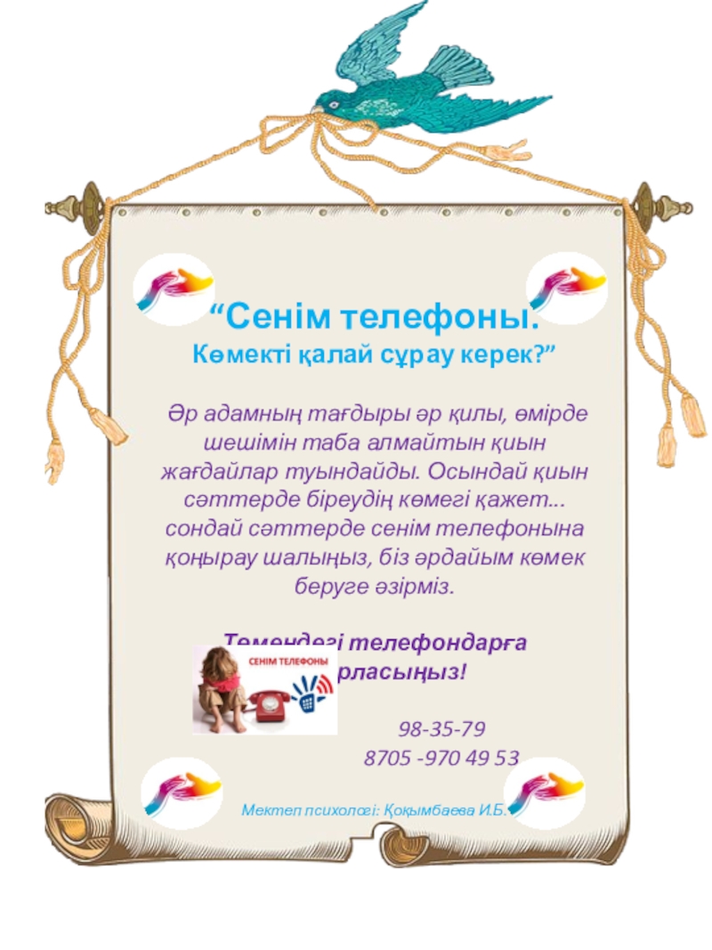 өмірде шешімін таба алмайтын қиын жағдайлар туындайды. Осындай қиын сәттерде біреудің көмегі қажет... сондай сәттерде сенім телефонына қоңырау шалыңыз, біз әрдайым көмек беруге әзірміз.