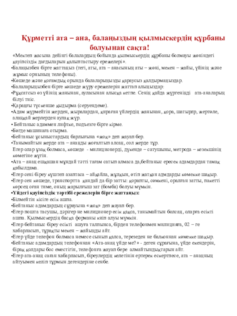 Слайд 4 Құрметті ата – ана, балаңыздың қылмыскердің құрбаны болуынан сақта!