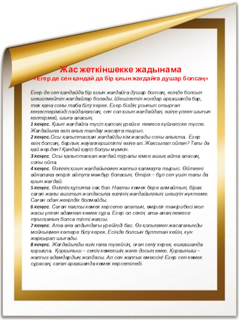 1 кеңес. Қиын жағдайға түсіп қалсаң үрейге немесе күйзеліске түспе. Жағдайыңа өзің анық талдау жасауға тырыс.