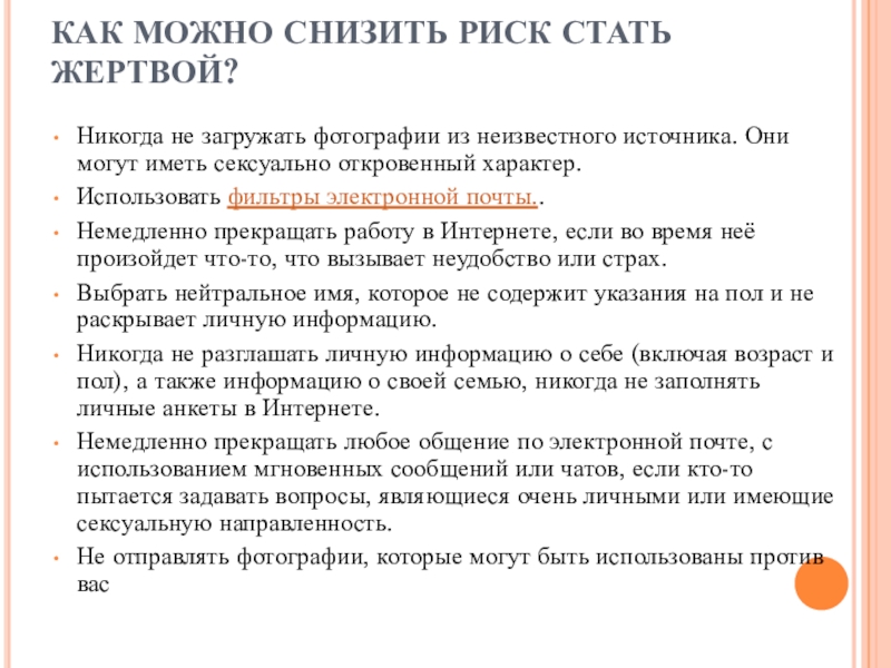 Немедленно прекращать любое общение по электронной почте, с использованием мгновенных сообщений или чатов, если кто-то пытается задавать вопросы, являющиеся очень личными или имеющие сексуальную направленность.