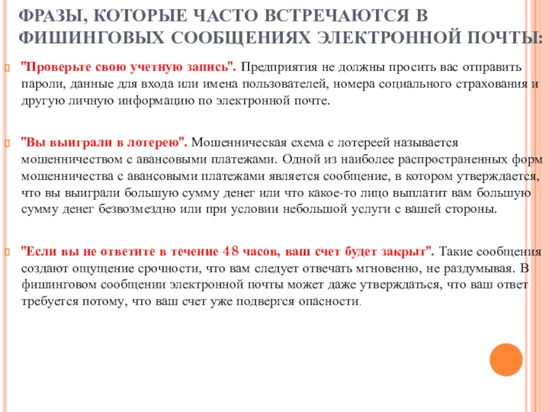 Слайд 9ФРАЗЫ, КОТОРЫЕ ЧАСТО ВСТРЕЧАЮТСЯ В ФИШИНГОВЫХ СООБЩЕНИЯХ ЭЛЕКТРОННОЙ ПОЧТЫ: