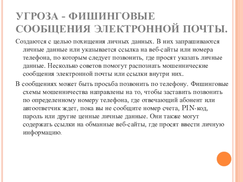 Слайд 7УГРОЗА - ФИШИНГОВЫЕ СООБЩЕНИЯ ЭЛЕКТРОННОЙ ПОЧТЫ.