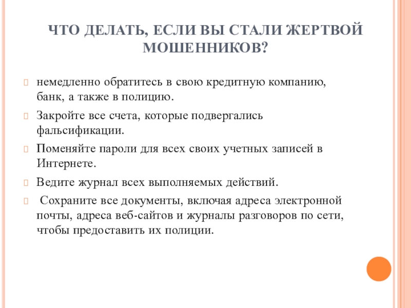 Слайд 13немедленно обратитесь в свою кредитную компанию, банк, а также в полицию.