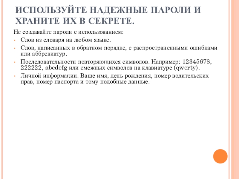 Слайд 4ИСПОЛЬЗУЙТЕ НАДЕЖНЫЕ ПАРОЛИ И ХРАНИТЕ ИХ В СЕКРЕТЕ.