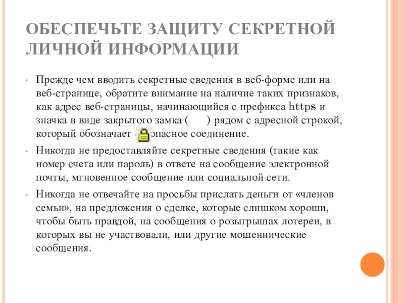 Слайд 3ОБЕСПЕЧЬТЕ ЗАЩИТУ СЕКРЕТНОЙ ЛИЧНОЙ ИНФОРМАЦИИ