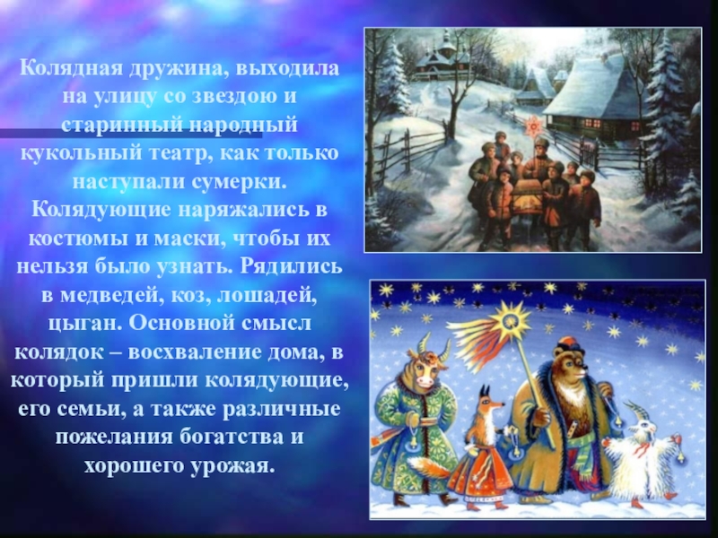 театр, как только наступали сумерки. Колядующие наряжались в костюмы и маски, чтобы их нельзя было узнать. Рядились в медведей, коз, лошадей, цыган. Основной смысл колядок – восхваление дома, в который пришли колядующие, его семьи, а также различные пожелания богатства и хорошего урожая.
