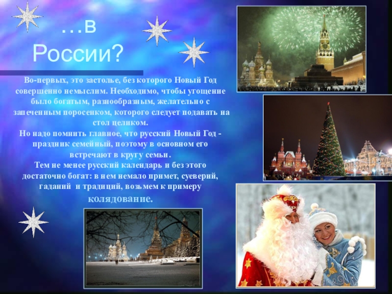 Но надо помнить главное, что русский Новый Год -праздник семейный, поэтому в основном его встречают в кругу семьи.