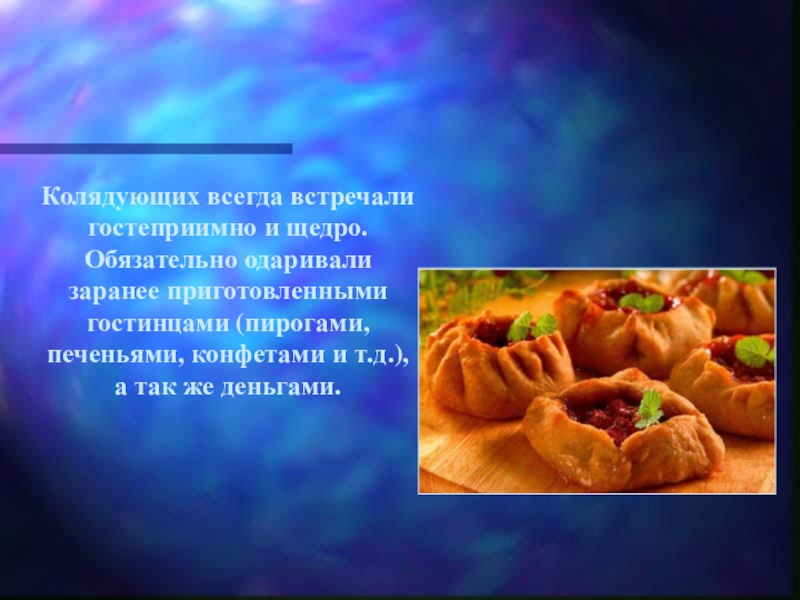 Слайд 14Колядующих всегда встречали гостеприимно и щедро. Обязательно одаривали заранее приготовленными гостинцами