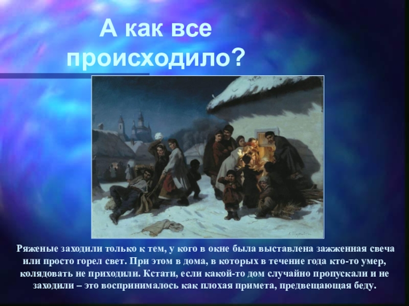 Слайд 15Не впустить колядующих являлось плохой приметой. Кроме того, в случае собственной