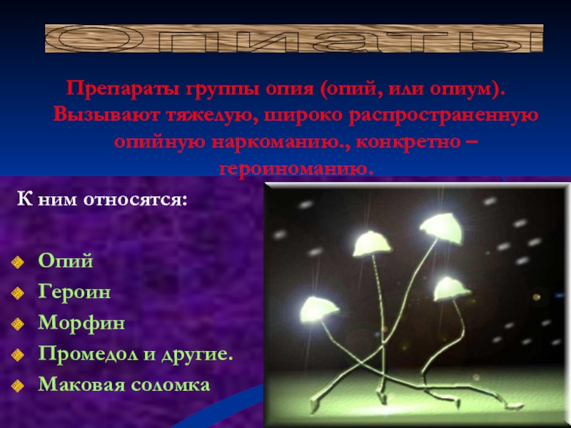 Препараты группы опия (опий, или опиум). Вызывают тяжелую, широко распространенную опийную наркоманию., конкретно – героиноманию.