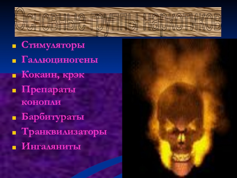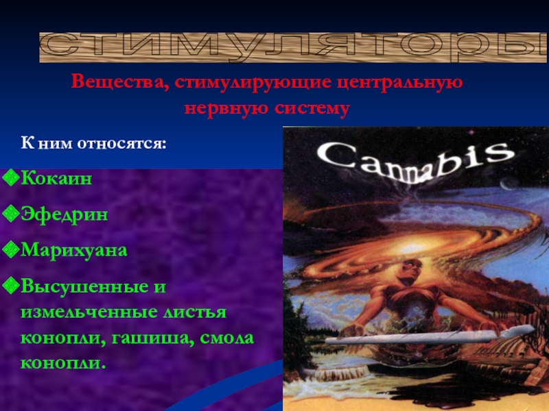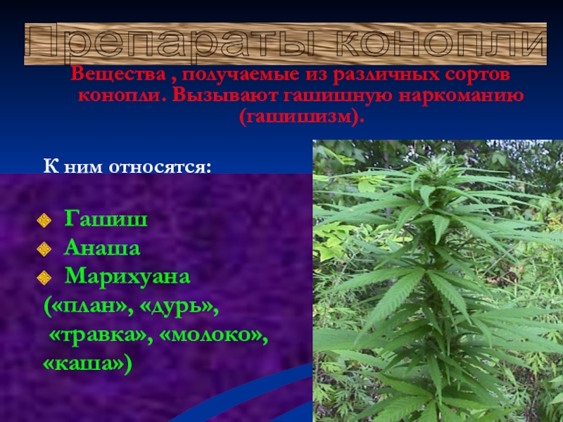 Вещества , получаемые из различных сортов конопли. Вызывают гашишную наркоманию (гашишизм).