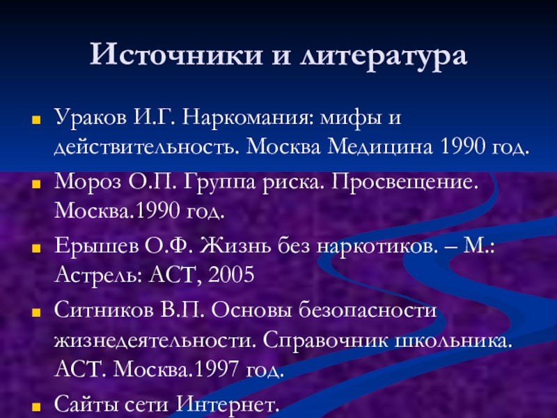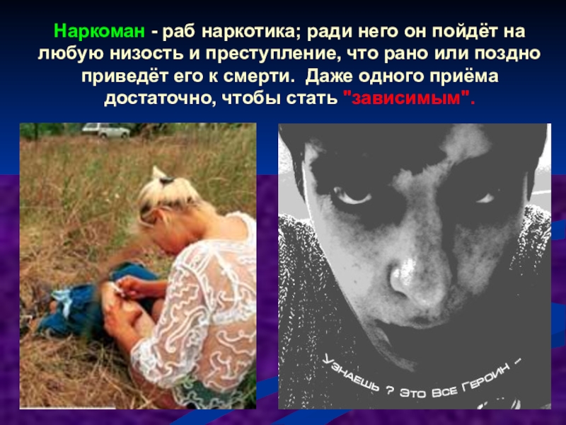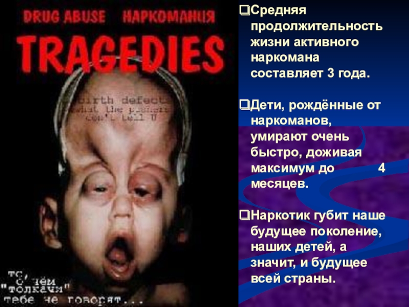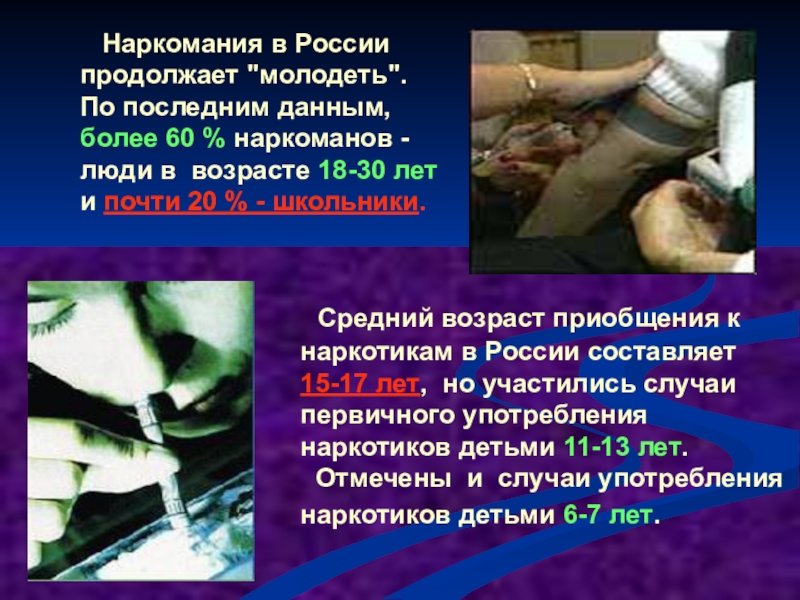 Наркомания в России продолжает "молодеть". По последним данным, более 60 % наркоманов - люди в возрасте 18-30 лет и почти 20 % - школьники.