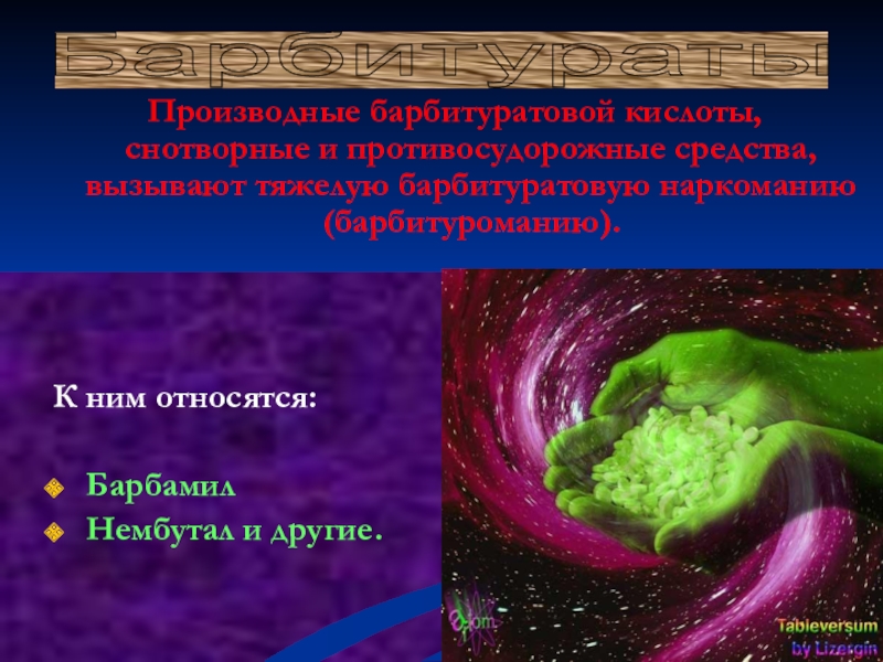 Производные барбитуратовой кислоты, снотворные и противосудорожные средства, вызывают тяжелую барбитуратовую наркоманию (барбитуроманию).