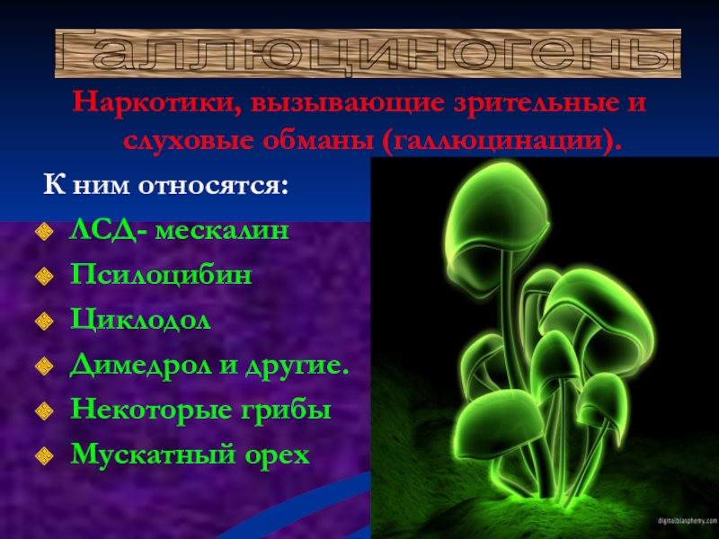Наркотики, вызывающие зрительные и слуховые обманы (галлюцинации).