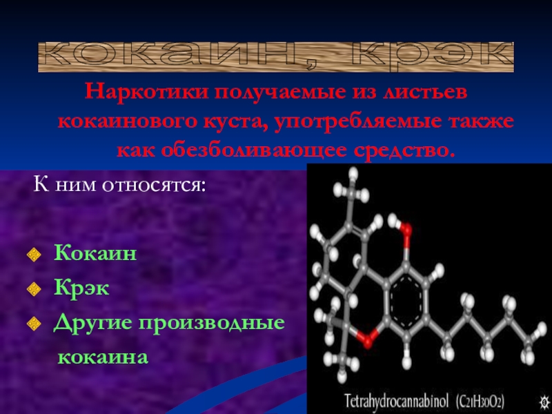 Наркотики получаемые из листьев кокаинового куста, употребляемые также как обезболивающее средство.