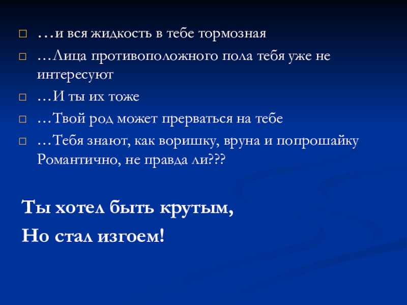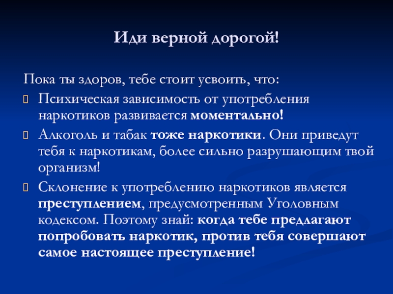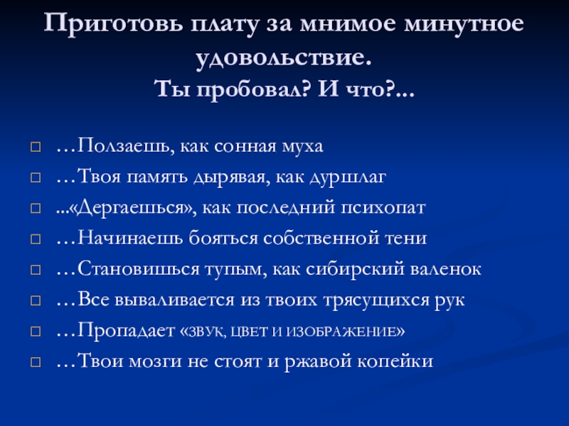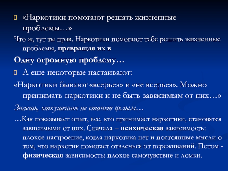 …Как показывает опыт, все, кто принимает наркотики, становятся зависимыми от них. Сначала – психическая зависимость: плохое настроение, когда наркотика нет и постоянные мысли о том, что наркотик помогает отвлечься от переживаний. Потом - физическая зависимость: плохое самочувствие и ломки.