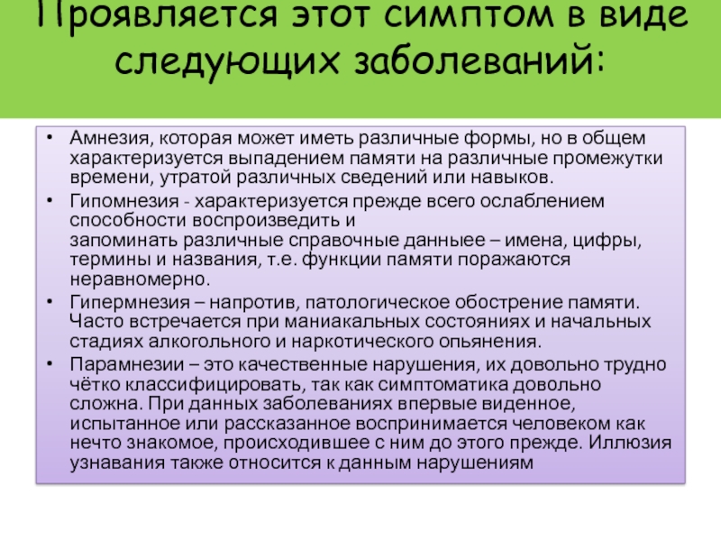 жизни человека. Выделяют два основных их вида – количественные нарушения, которые проявляются в выпадении, ослаблении или усилении следов памяти, и нарушения качественные (парамнезия), выражающиеся в появлении ложных воспоминаний, в смешении реальности, прошлого, настоящего и воображаемого.