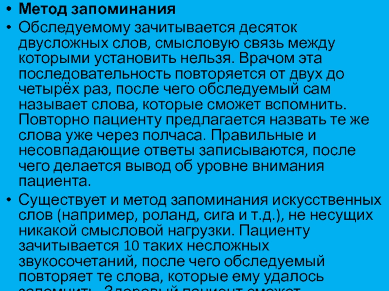 Существует и метод запоминания искусственных слов (например, роланд, сига и т.д.), не несущих никакой смысловой нагрузки. Пациенту зачитывается 10 таких несложных звукосочетаний, после чего обследуемый повторяет те слова, которые ему удалось запомнить. Здоровый пациент сможет воспроизвести все без исключения слова после 5-7 их повторений врачом.
