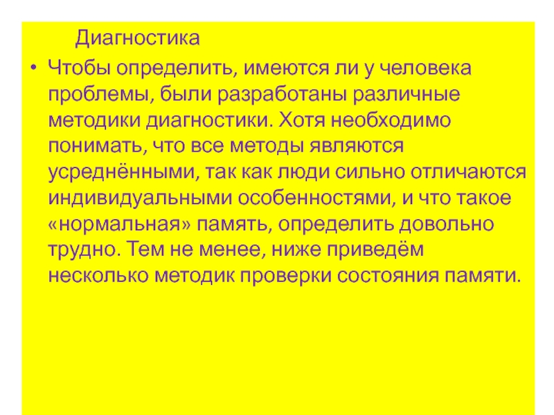 проблемы, были разработаны различные методики диагностики. Хотя необходимо понимать, что все методы являются усреднёнными, так как люди сильно отличаются индивидуальными особенностями, и что такое «нормальная» память, определить довольно трудно. Тем не менее, ниже приведём несколько методик проверки состояния памяти.