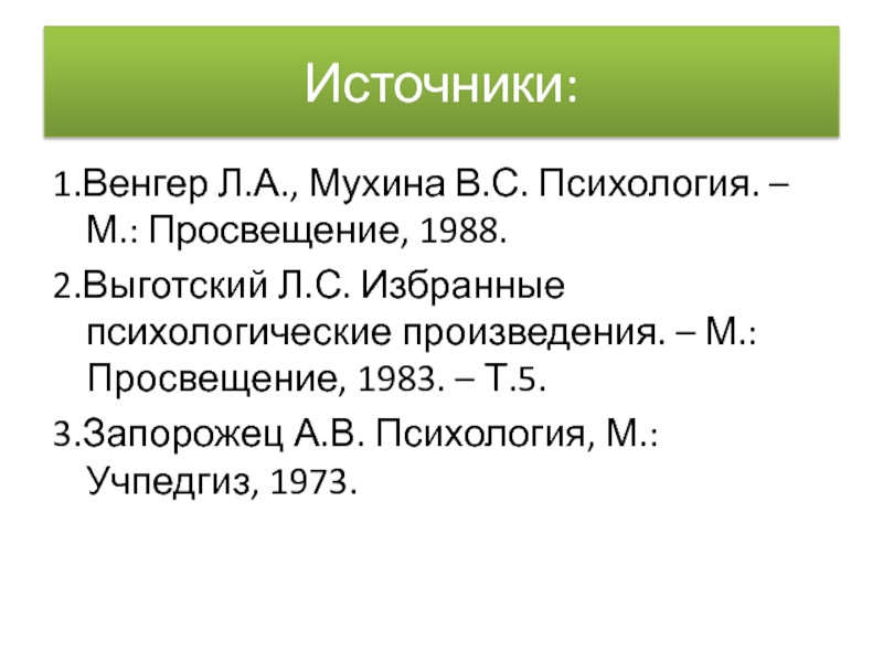 3.Запорожец А.В. Психология, М.: Учпедгиз, 1973.