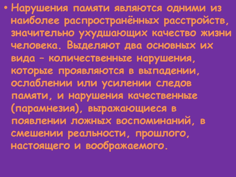 Слайд 6Нарушения памяти являются одними из наиболее распространённых расстройств, значительно ухудшающих качество