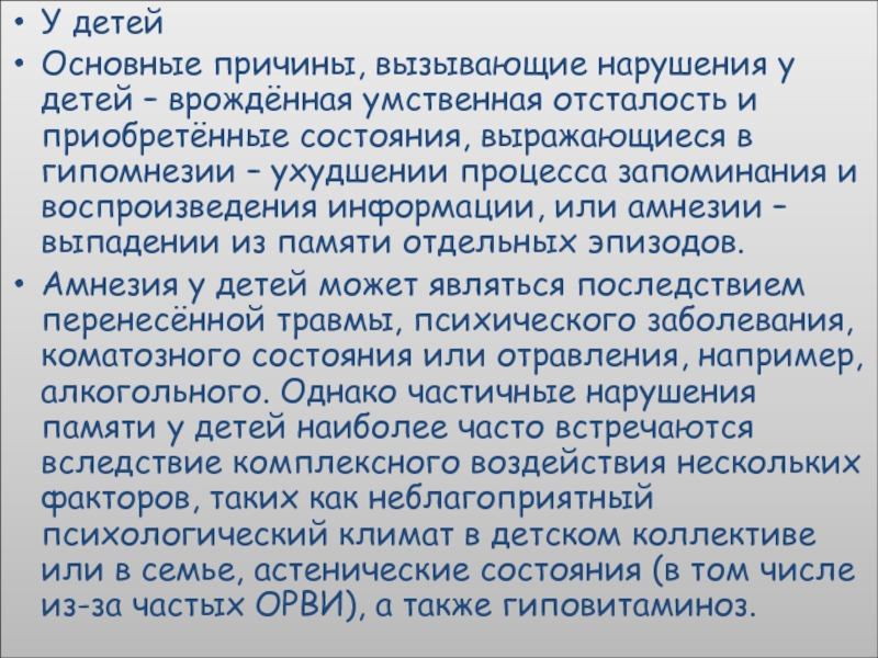 Амнезия у детей может являться последствием перенесённой травмы, психического заболевания, коматозного состояния или отравления, например, алкогольного. Однако частичные нарушения памяти у детей наиболее часто встречаются вследствие комплексного воздействия нескольких факторов, таких как неблагоприятный психологический климат в детском коллективе или в семье, астенические состояния (в том числе из-за частых ОРВИ), а также гиповитаминоз.