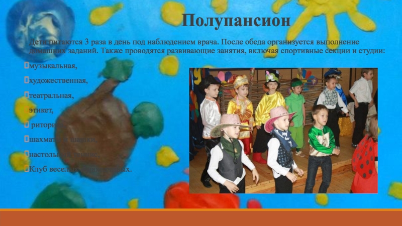 организуется выполнение домашних заданий. Также проводятся развивающие занятия, включая спортивные секции и студии: