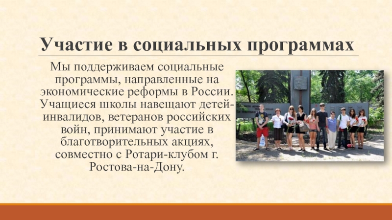 в России. Учащиеся школы навещают детей-инвалидов, ветеранов российских войн, принимают участие в благотворительных акциях, совместно с Ротари-клубом г.Ростова-на-Дону.