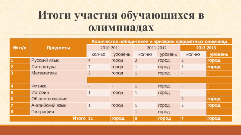 Слайд 10Итоги участия обучающихся в олимпиадах