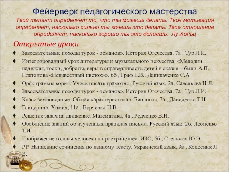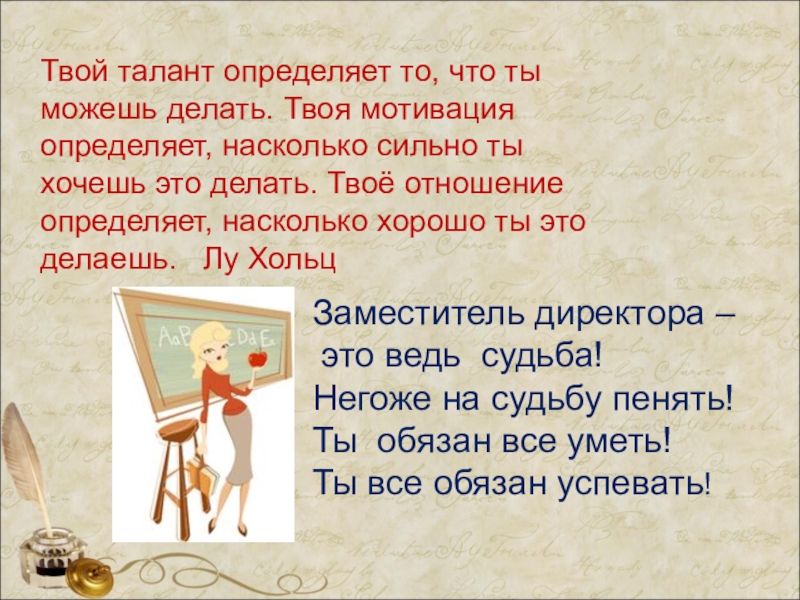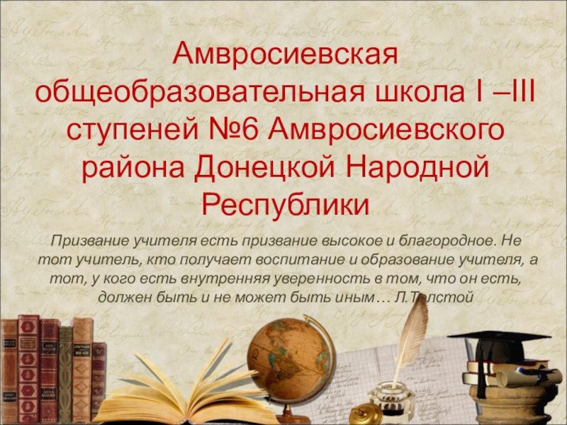 Призвание учителя есть призвание высокое и благородное. Не тот учитель, кто получает воспитание и образование учителя, а тот, у кого есть внутренняя уверенность в том, что он есть, должен быть и не может быть иным… Л.Толстой