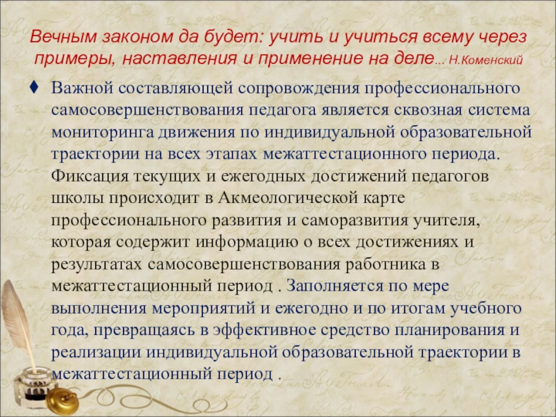 Важной составляющей сопровождения профессионального самосовершенствования педагога является сквозная система мониторинга движения по индивидуальной образовательной траектории на всех этапах межаттестационного периода. Фиксация текущих и ежегодных достижений педагогов школы происходит в Акмеологической карте профессионального развития и саморазвития учителя, которая содержит информацию о всех достижениях и результатах самосовершенствования работника в межаттестационный период . Заполняется по мере выполнения мероприятий и ежегодно и по итогам учебного года, превращаясь в эффективное средство планирования и реализации индивидуальной образовательной траектории в межаттестационный период .