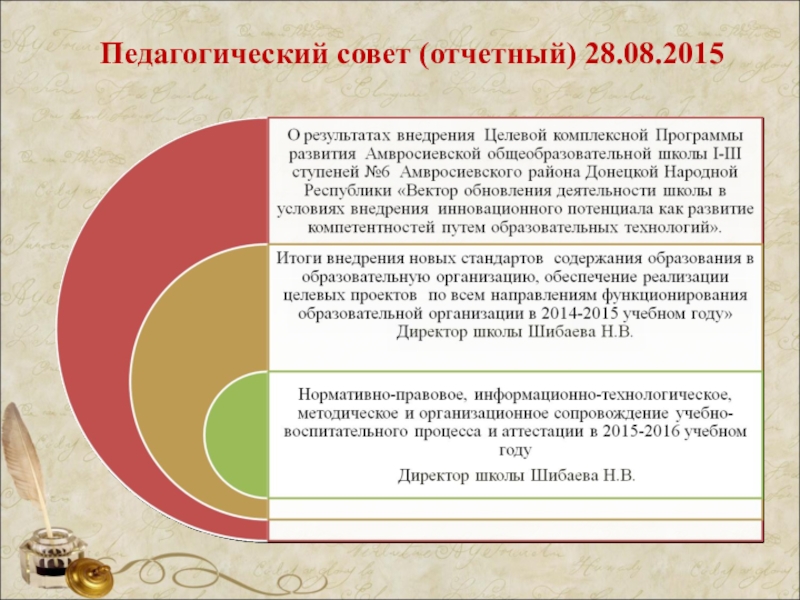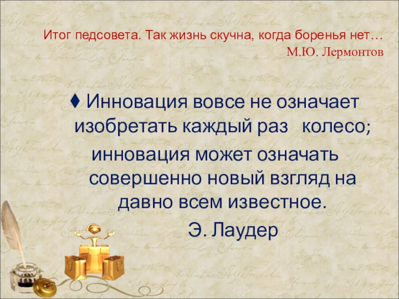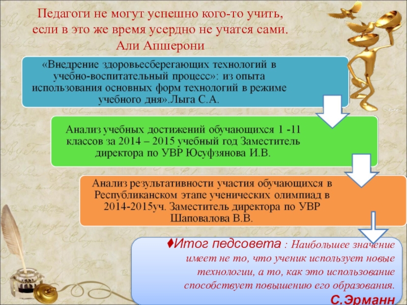 Итог педсовета : Наибольшее значение имеет не то, что ученик использует новые технологии, а то, как это использование способствует повышению его образования. С.Эрманн