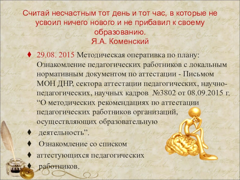 29.08. 2015 Методическая оперативка по плану: Ознакомление педагогических работников с локальным нормативным документом по аттестации - Письмом МОН ДНР, сектора аттестации педагогических, научно-педагогических, научных кадров №3802 от 08.09.2015 г. “О методических рекомендациях по аттестации педагогических работников организаций, осуществляющих образовательную