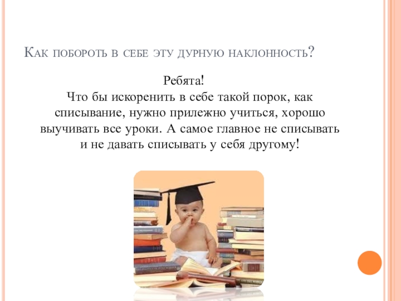 Как побороть в себе эту дурную наклонность?Ребята! Что бы искоренить в себе такой порок, как списывание, нужно