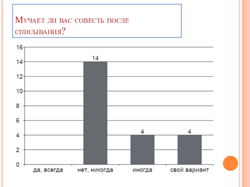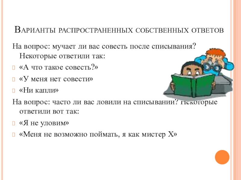 Варианты распространенных собственных ответовНа вопрос: мучает ли вас совесть после списывания? Некоторые ответили так:«А что такое совесть?»«У