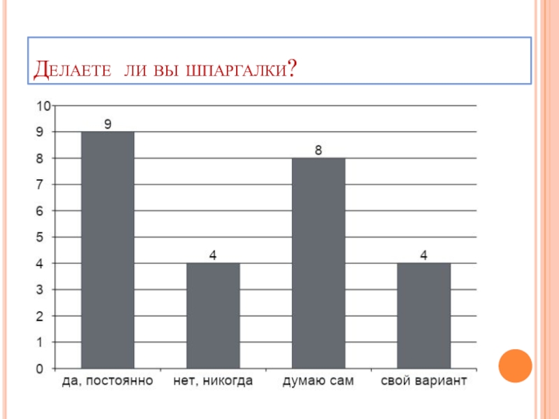 Цели:Провести социологический опрос, выяснить, много ли ребят позитивно относятся к списываниюПредложить свои способы решения проблемыОбъяснить ребятам, к