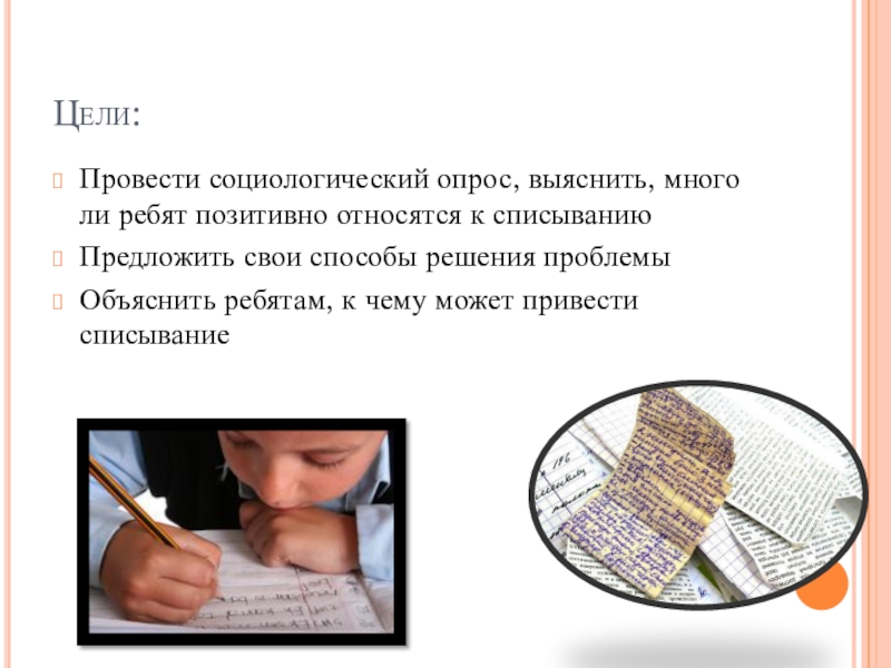 Цели:Провести социологический опрос, выяснить, много ли ребят позитивно относятся к списываниюПредложить свои способы решения проблемыОбъяснить ребятам, к чему может привести списывание