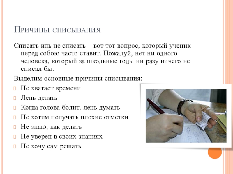 Причины списыванияСписать иль не списать – вот тот вопрос, который ученик перед собою часто ставит. Пожалуй, нет