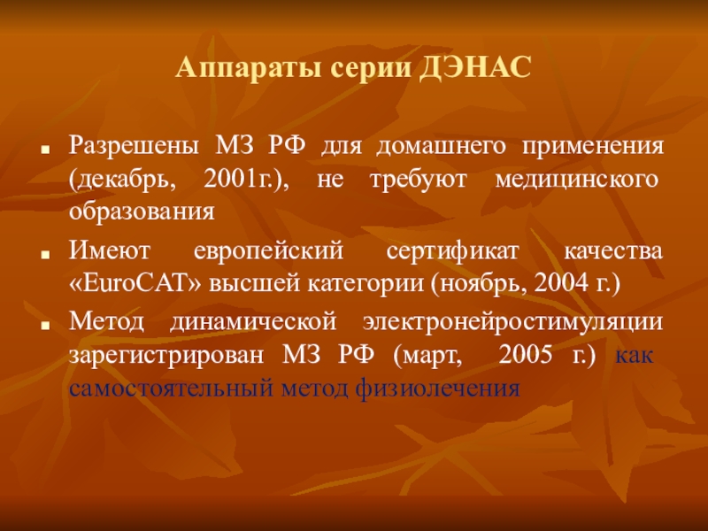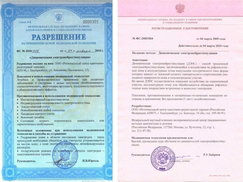 Метод динамической электронейростимуляции зарегистрирован МЗ РФ (март, 2005 г.) как самостоятельный метод физиолечения