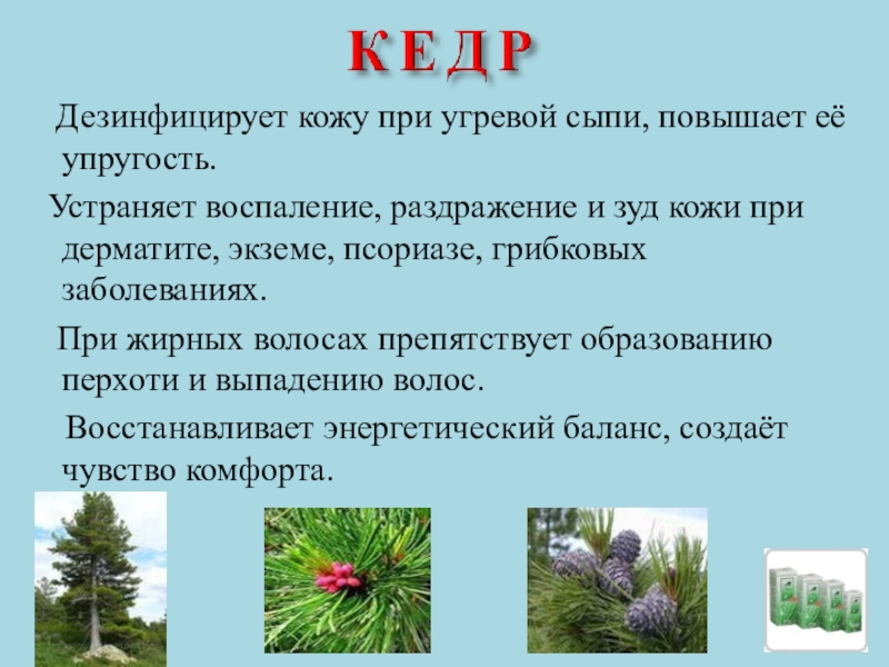 Слайд 9 Дезинфицирует кожу при угревой сыпи, повышает её упругость.