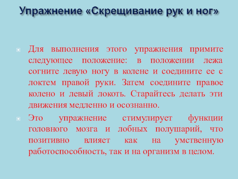 Это упражнение стимулирует функции головного мозга и лобных полушарий, что позитивно влияет как на умственную работоспособность, так и на организм в целом.