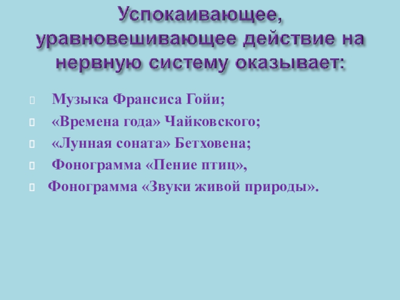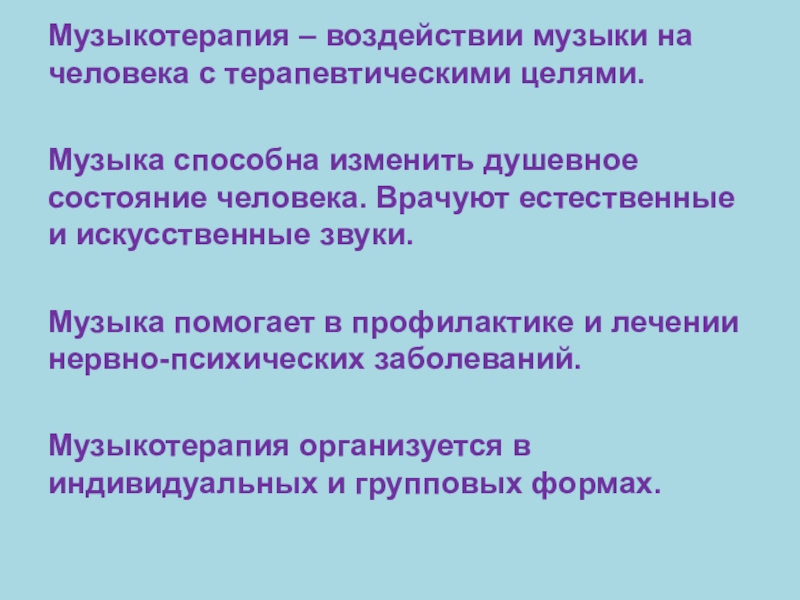 Слайд 26Музыкотерапия – воздействии музыки на человека с терапевтическими целями.