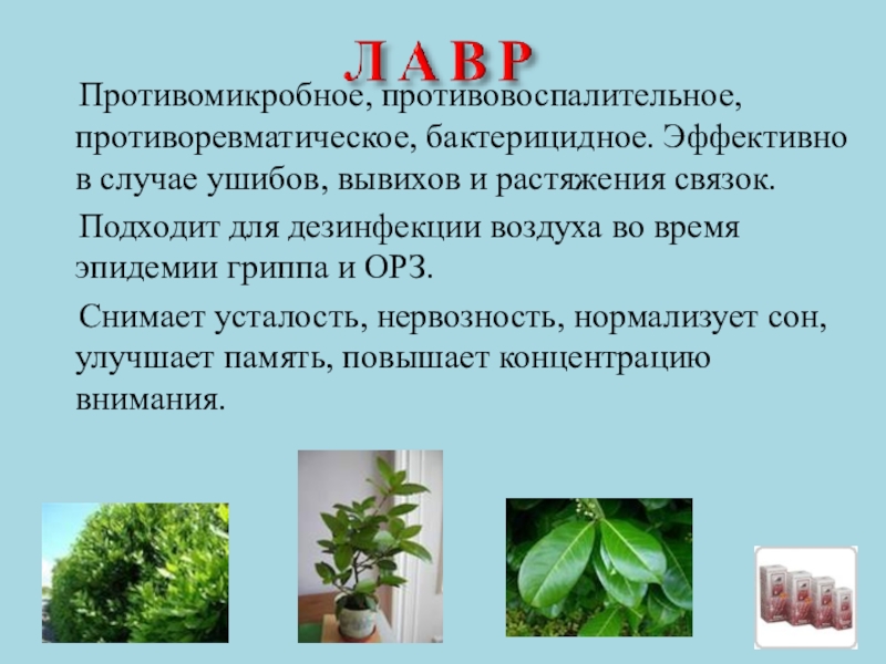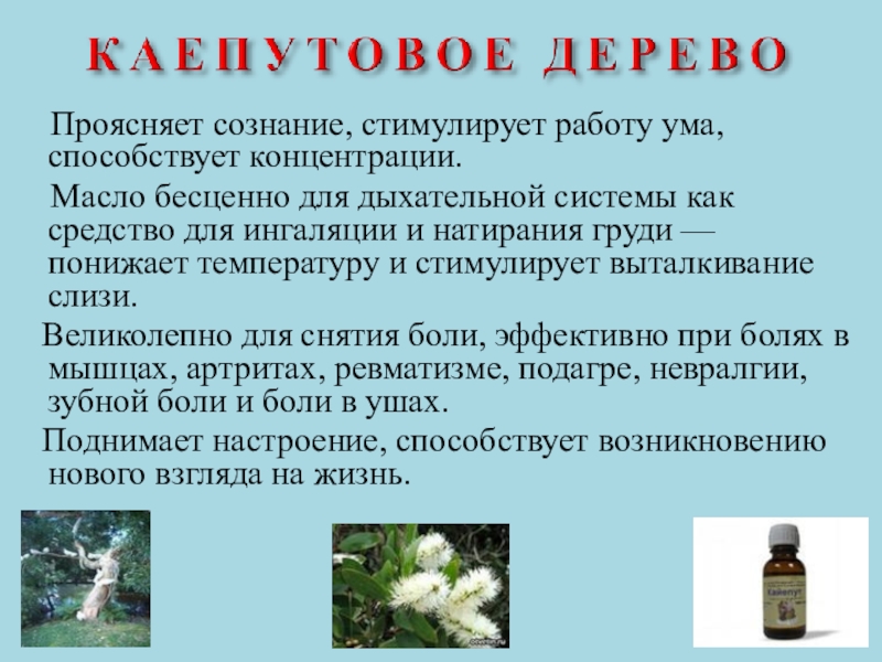 Слайд 10 Противомикробное, противовоспалительное, противоревматическое, бактерицидное. Эффективно в случае ушибов,