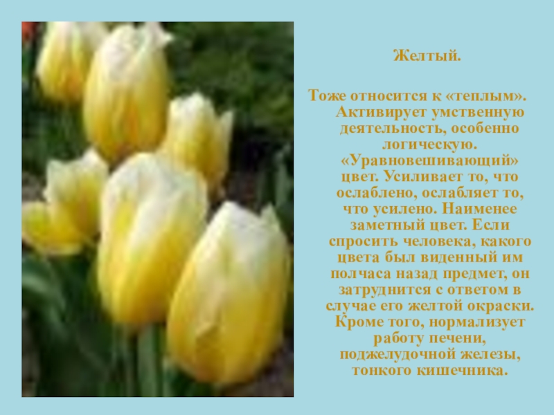 логическую. «Уравновешивающий» цвет. Усиливает то, что ослаблено, ослабляет то, что усилено. Наименее заметный цвет. Если спросить человека, какого цвета был виденный им полчаса назад предмет, он затруднится с ответом в случае его желтой окраски. Кроме того, нормализует работу печени, поджелудочной железы, тонкого кишечника.