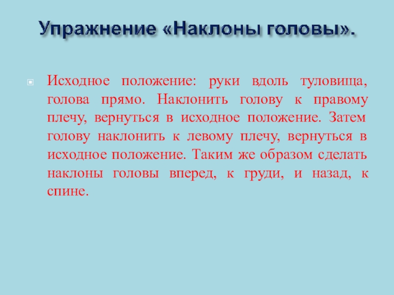 Слайд 42Исходное положение: руки вдоль туловища, голова прямо. Наклонить голову к правому